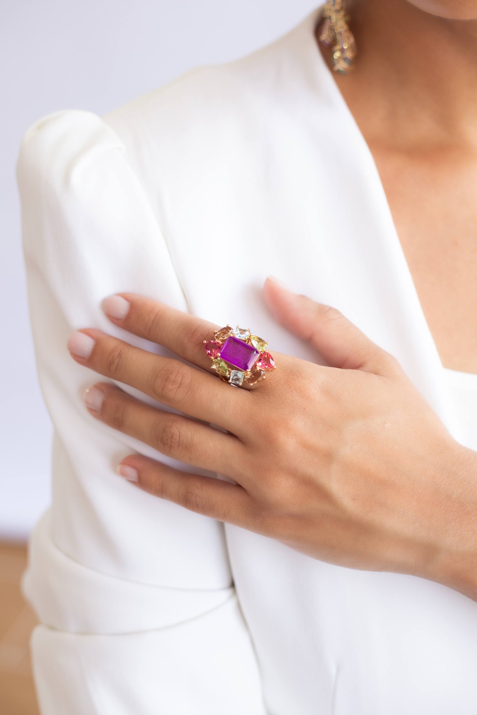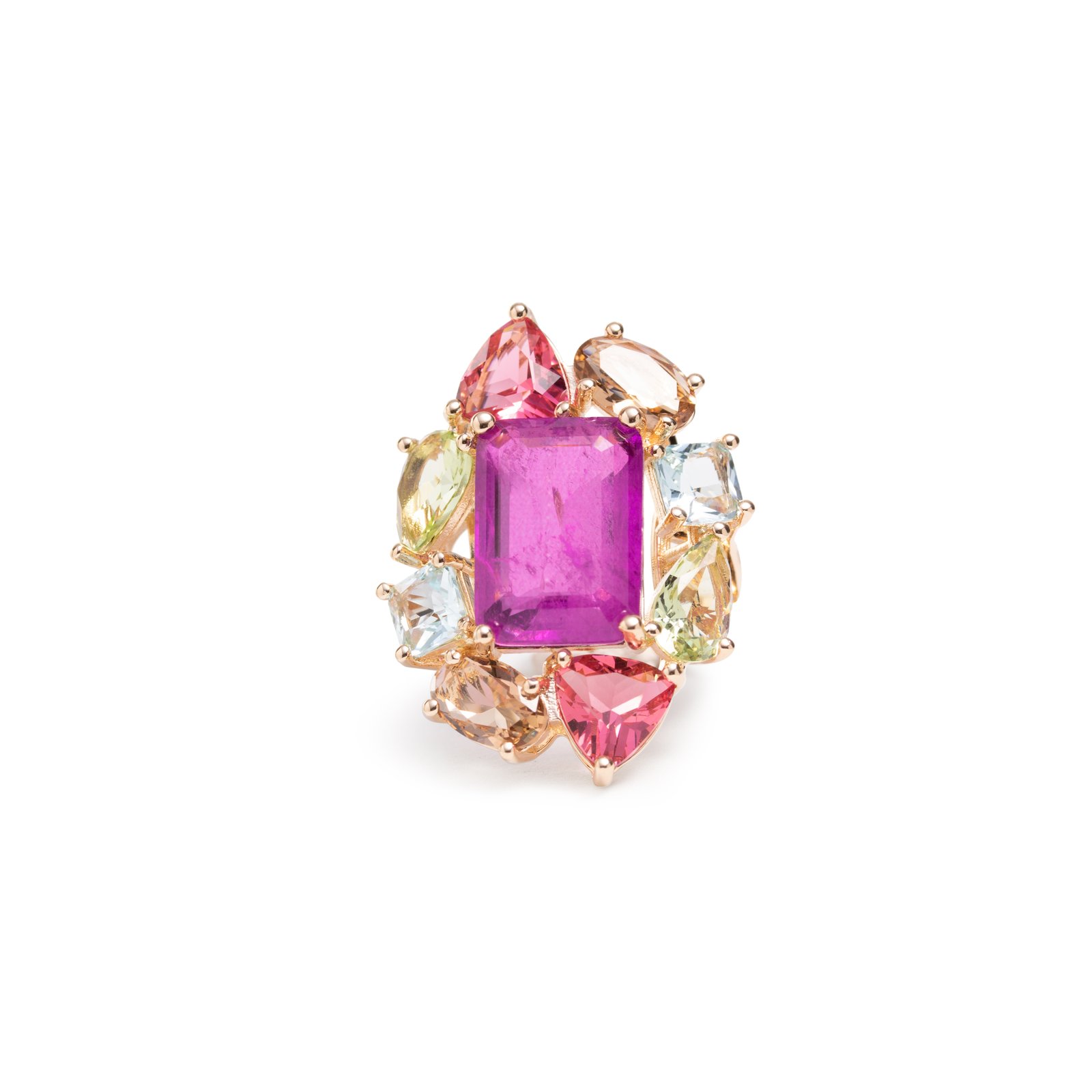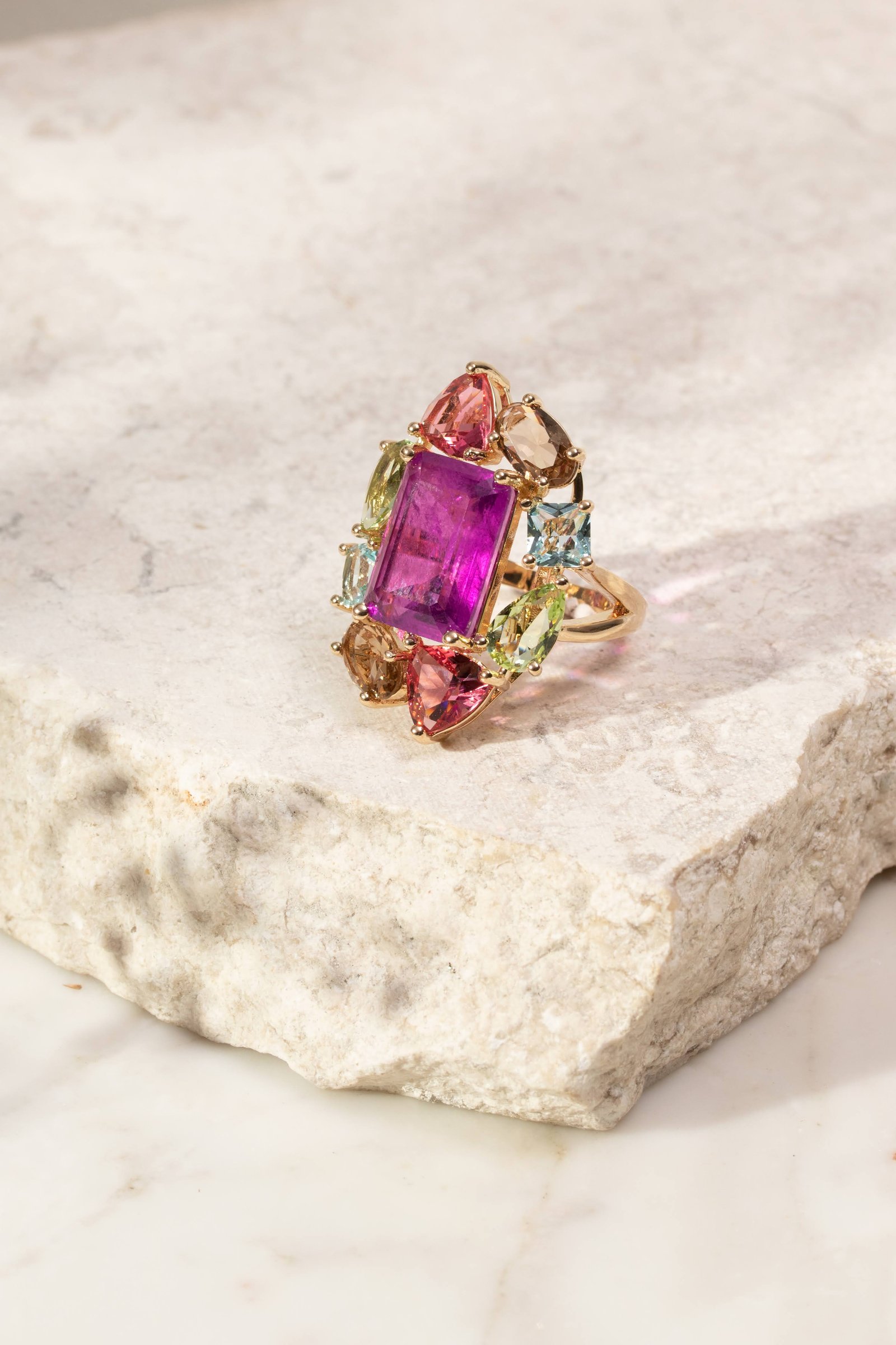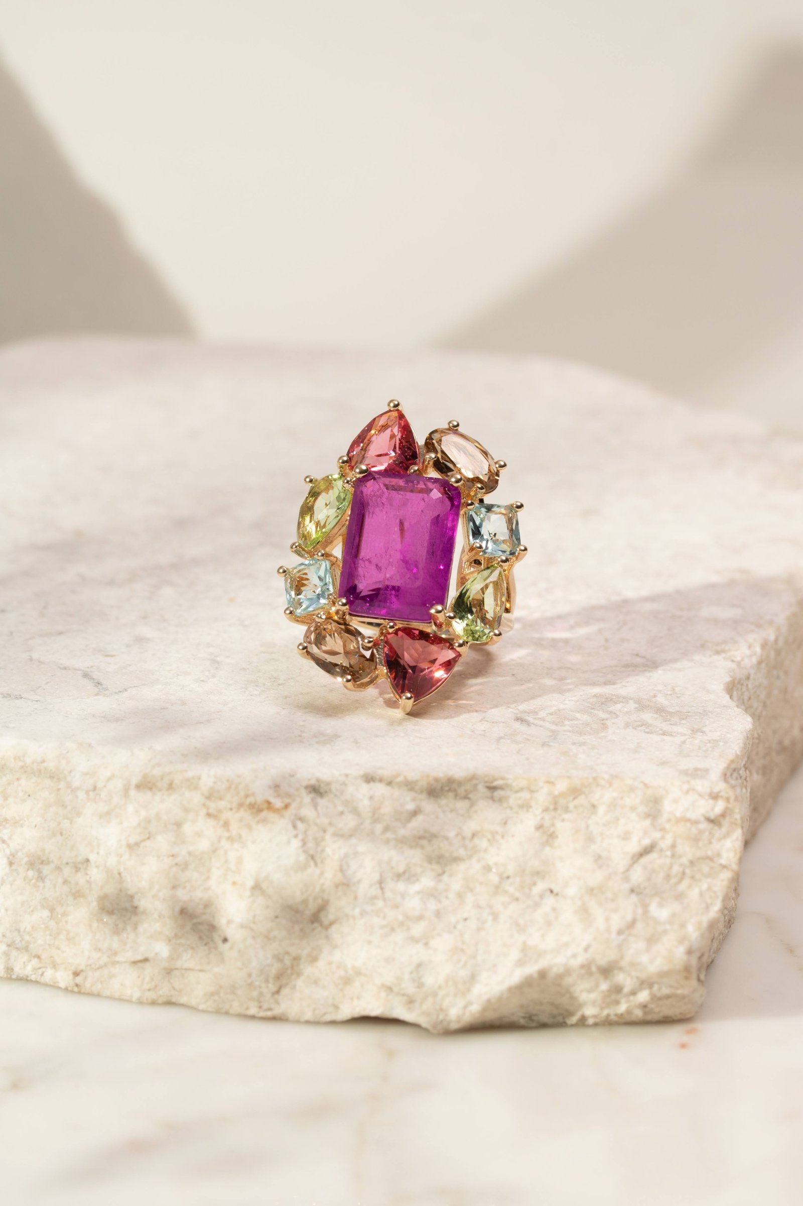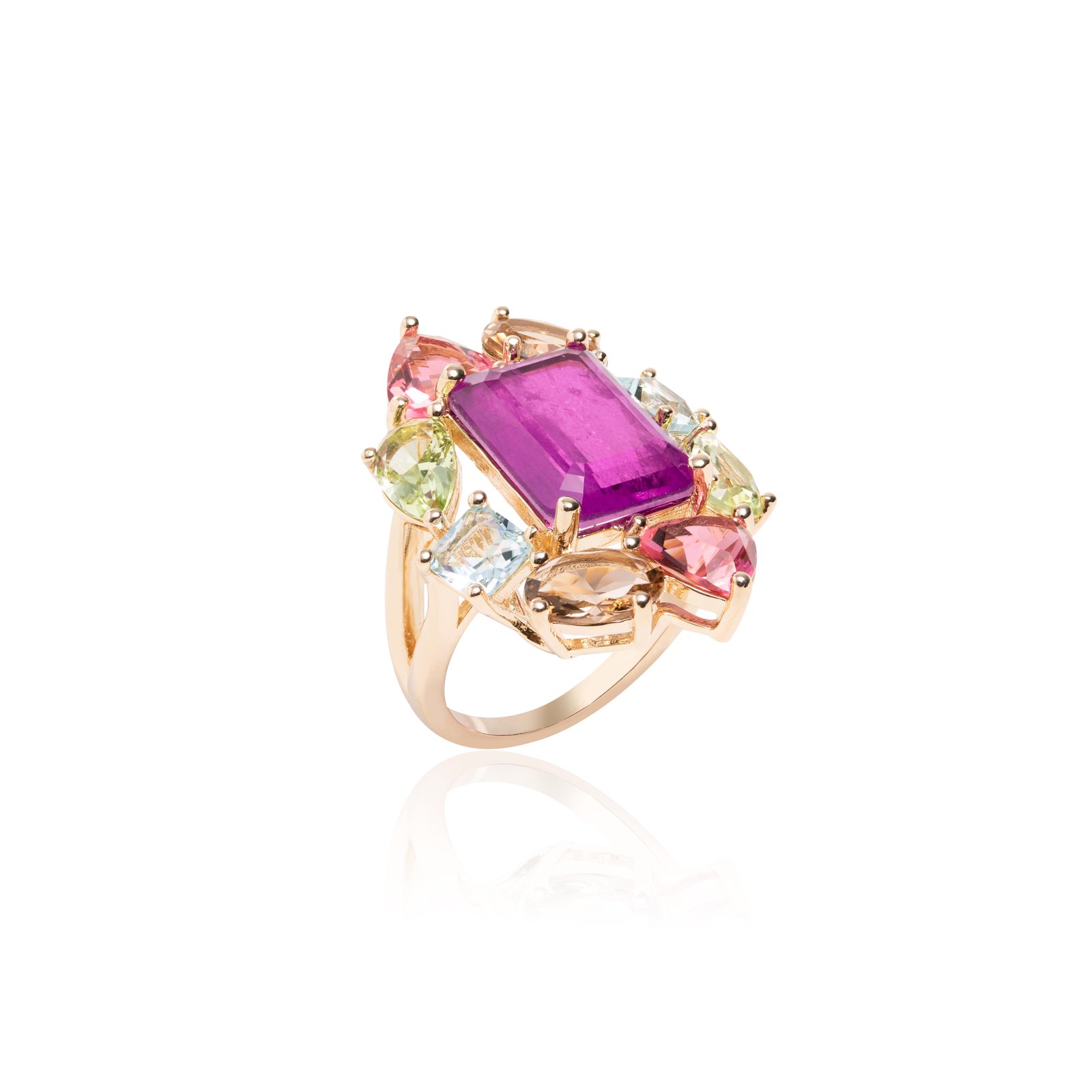 Anel maxi com fusion ametista e cristais de ametista verde, topázio azul, turmalina rosa e topázio fumê.