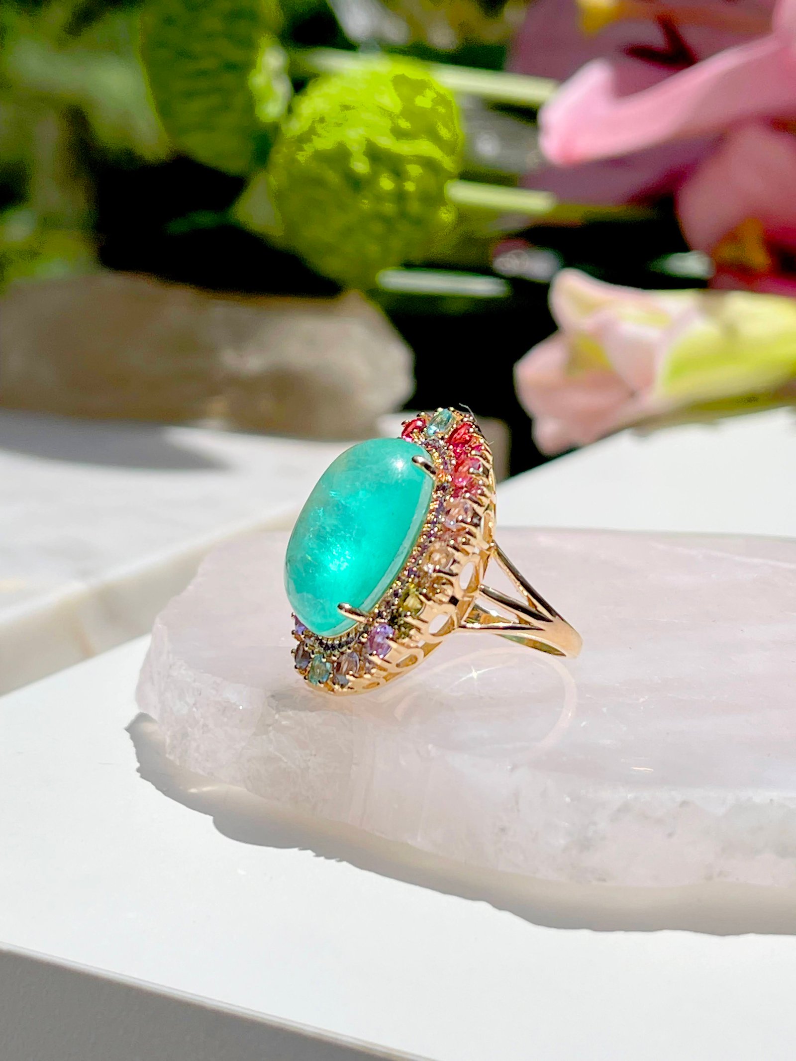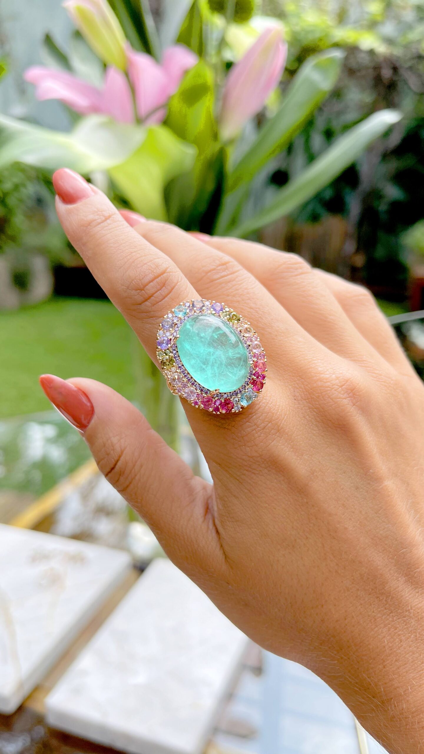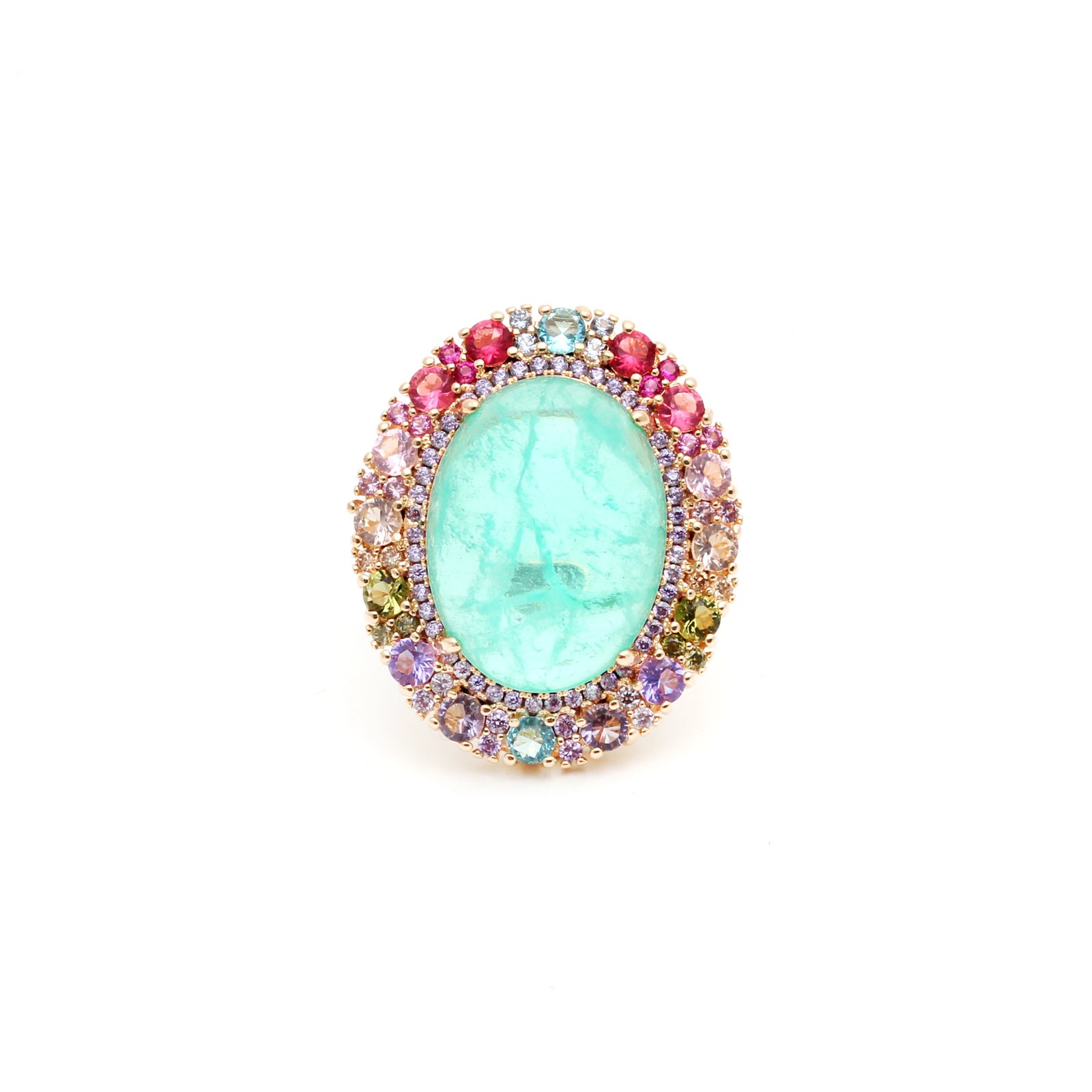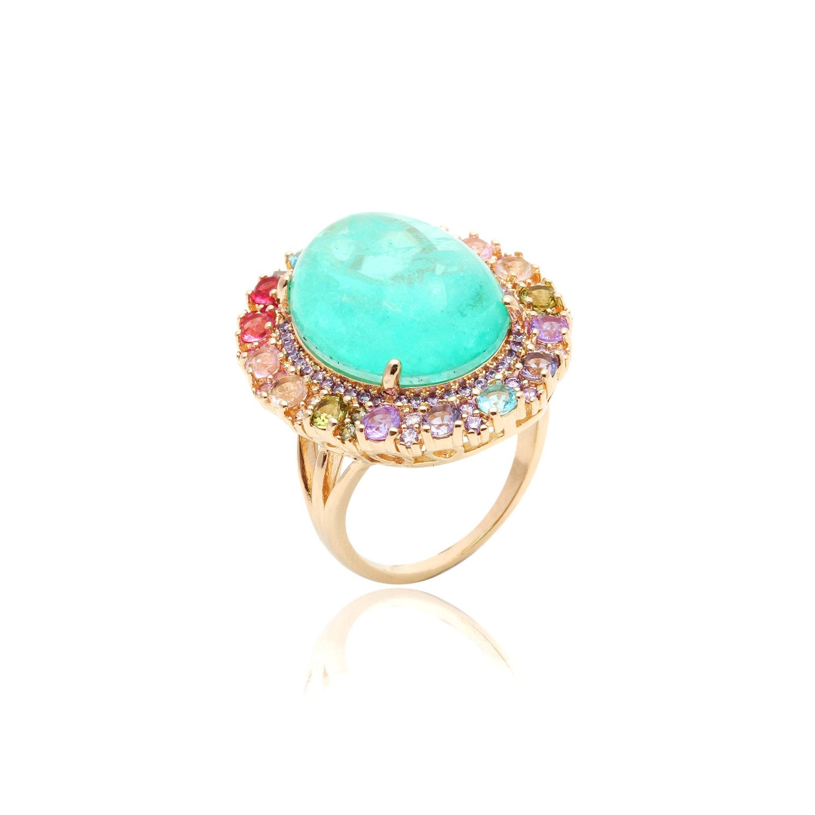 Anel semi joia esfera verde cravejada ao redor de cristais