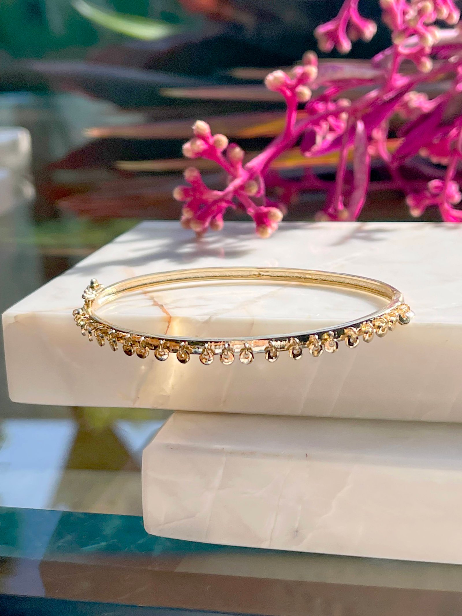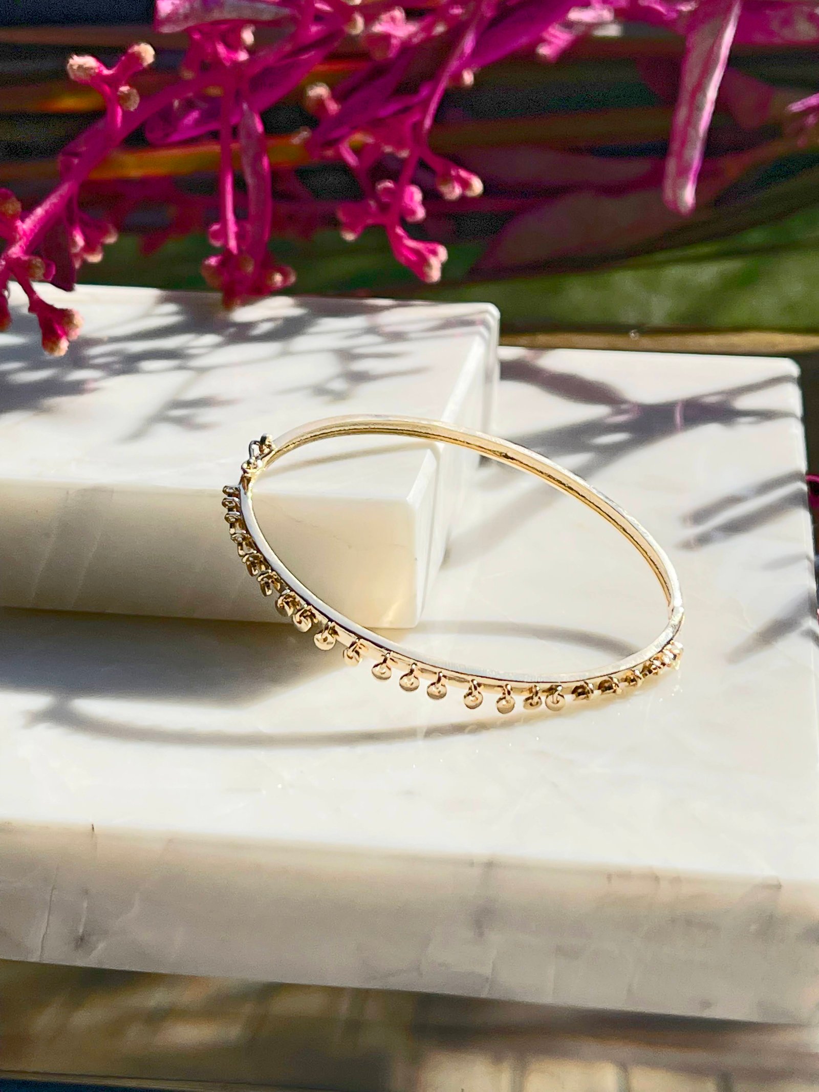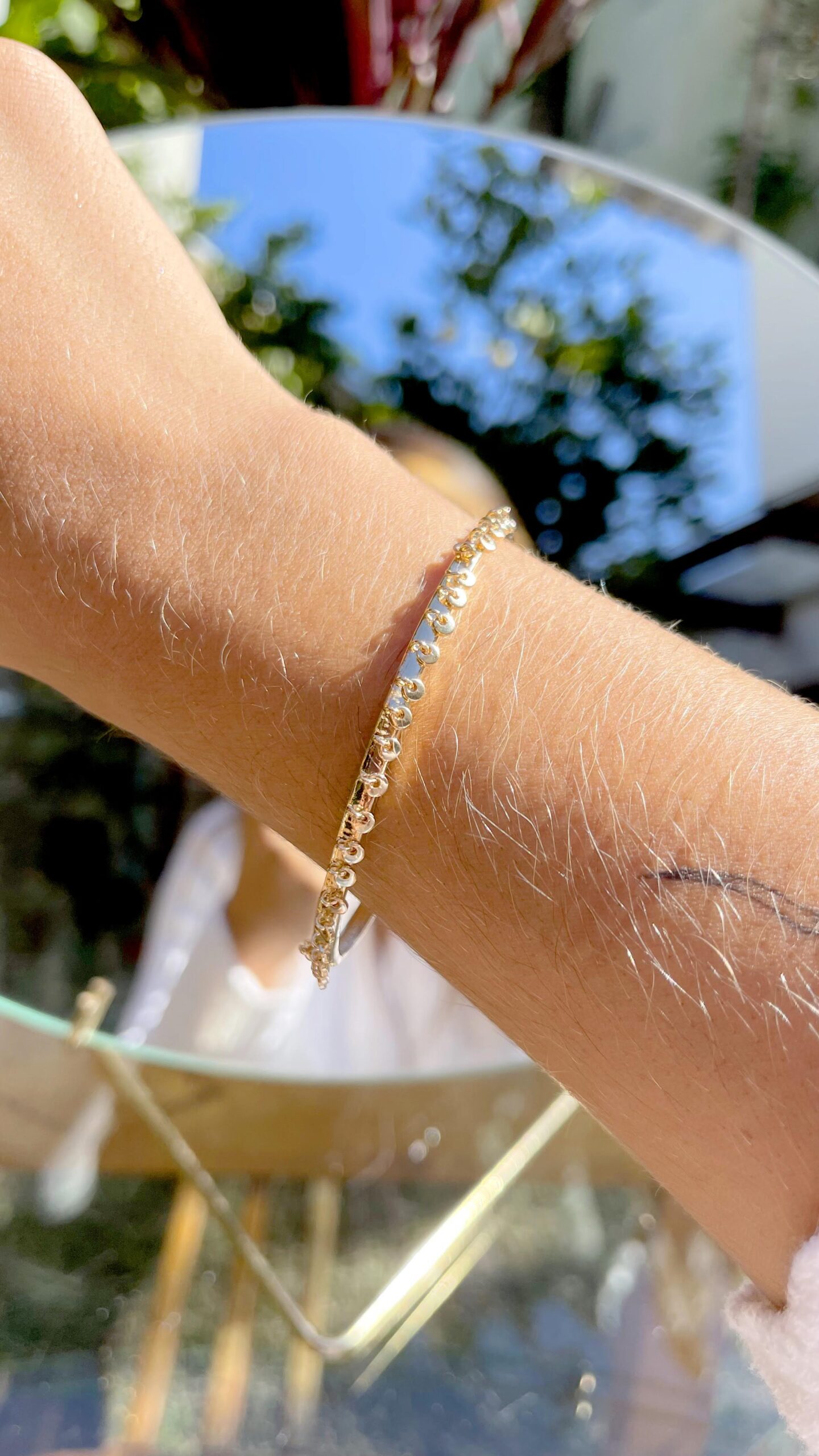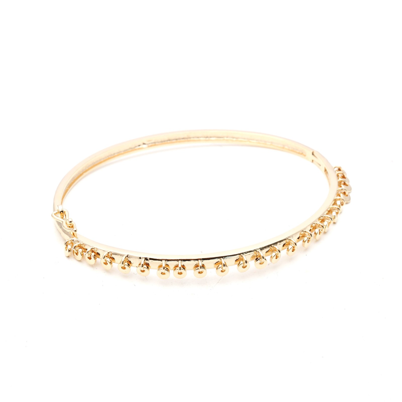 O bracelete banhado a ouro 18k traz chapinhas penduradas e fecho na lateral que facilita na hora de colocar ou retirar.