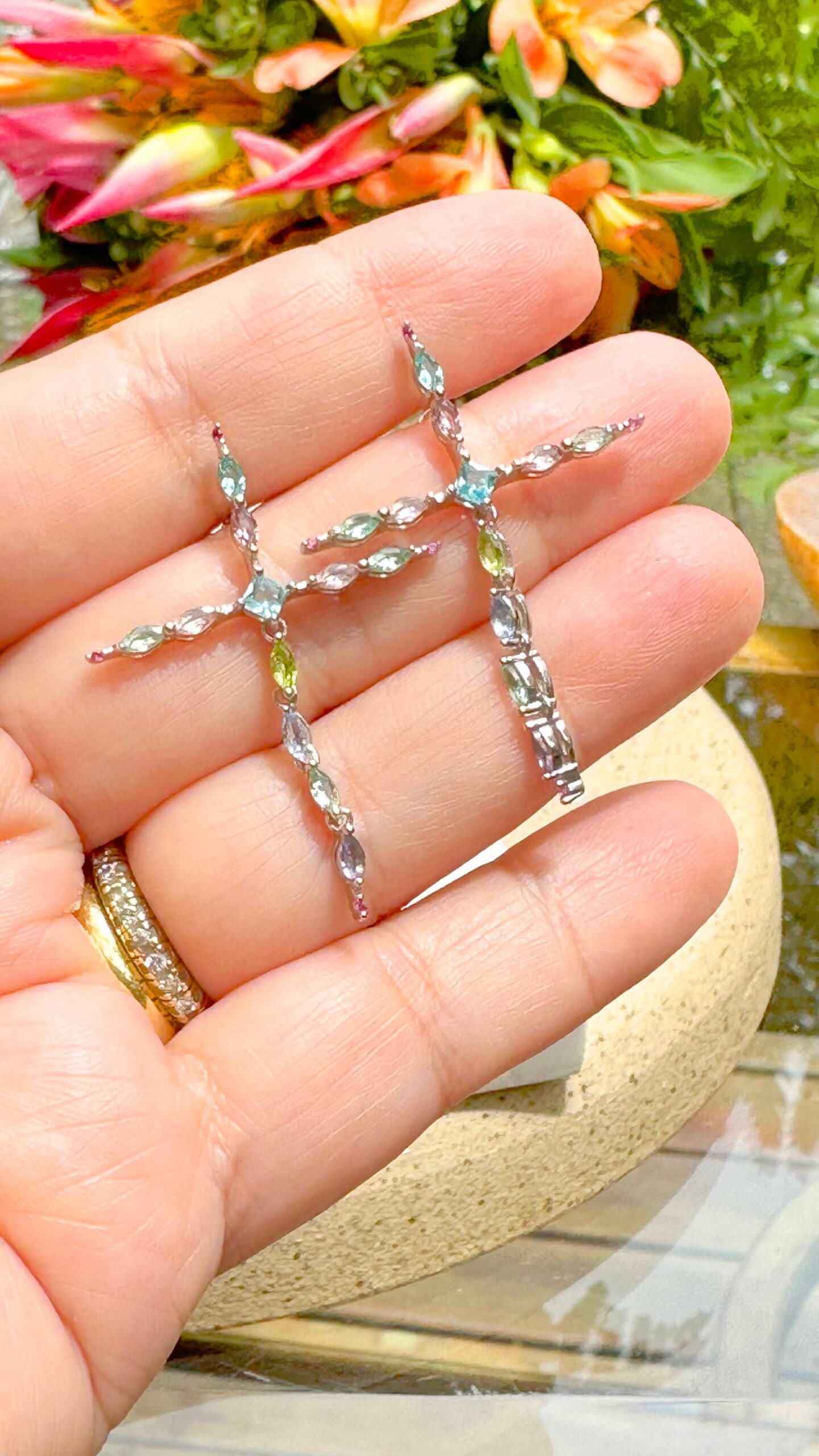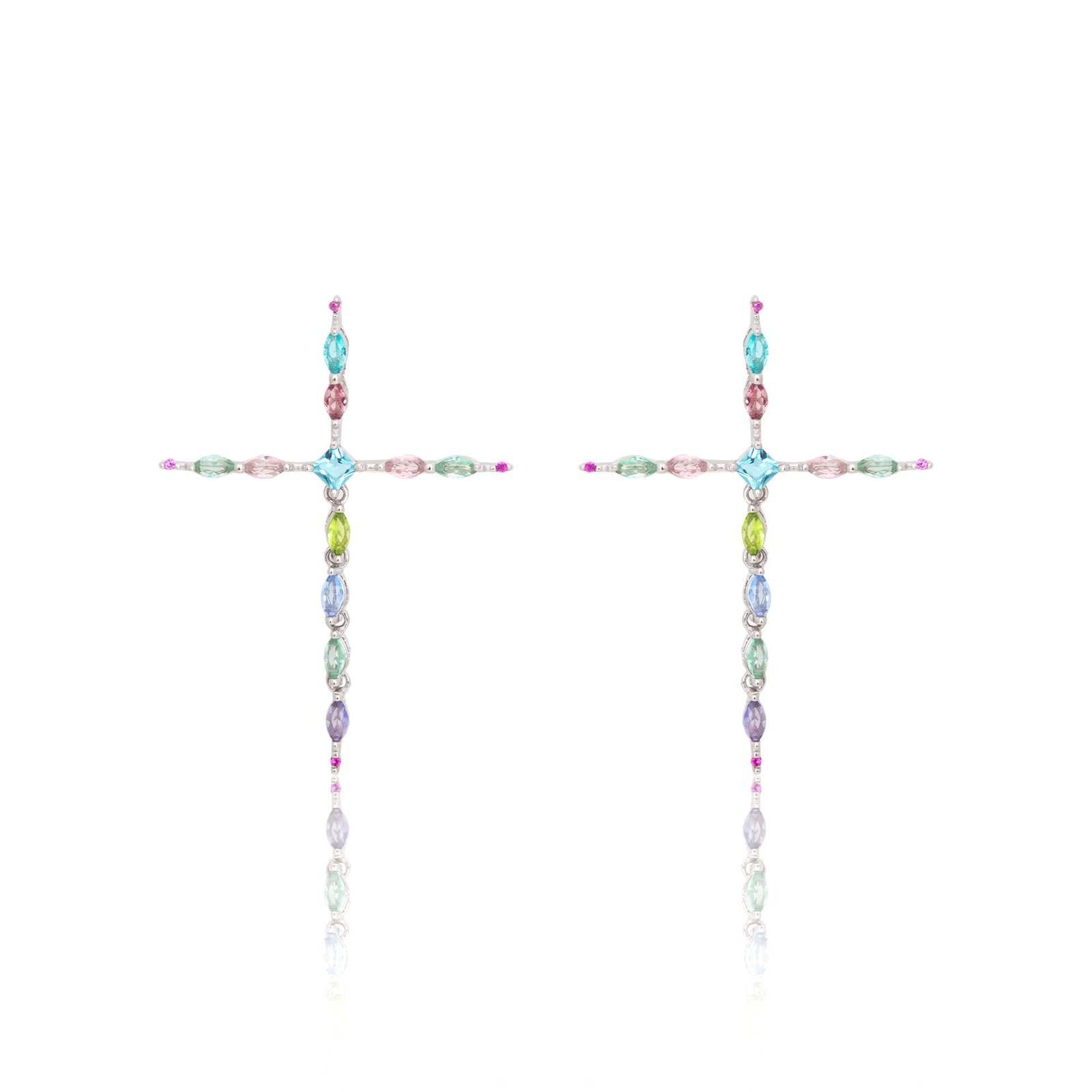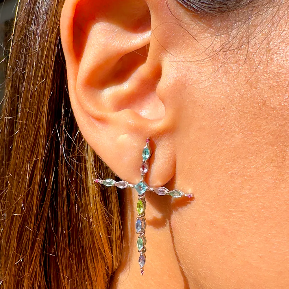 O brinco de prata 925 vem com cruz maleável de cristais de topázio azul, peridoto, ametista verde, quartzo rosa e paraíba.