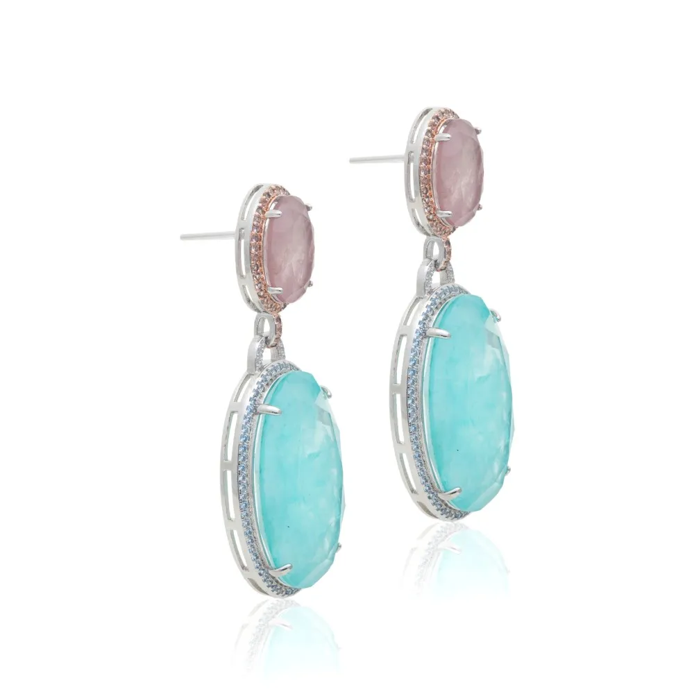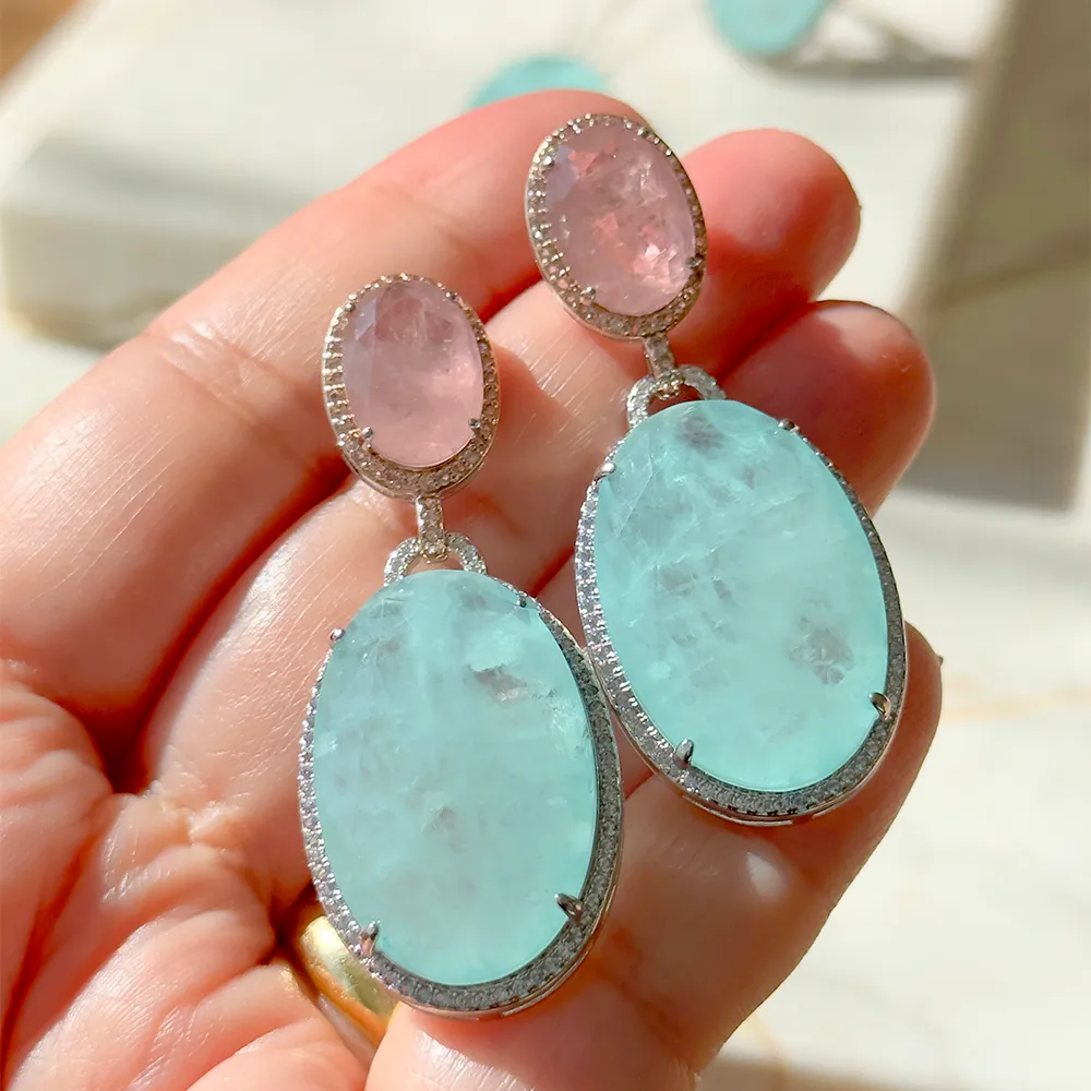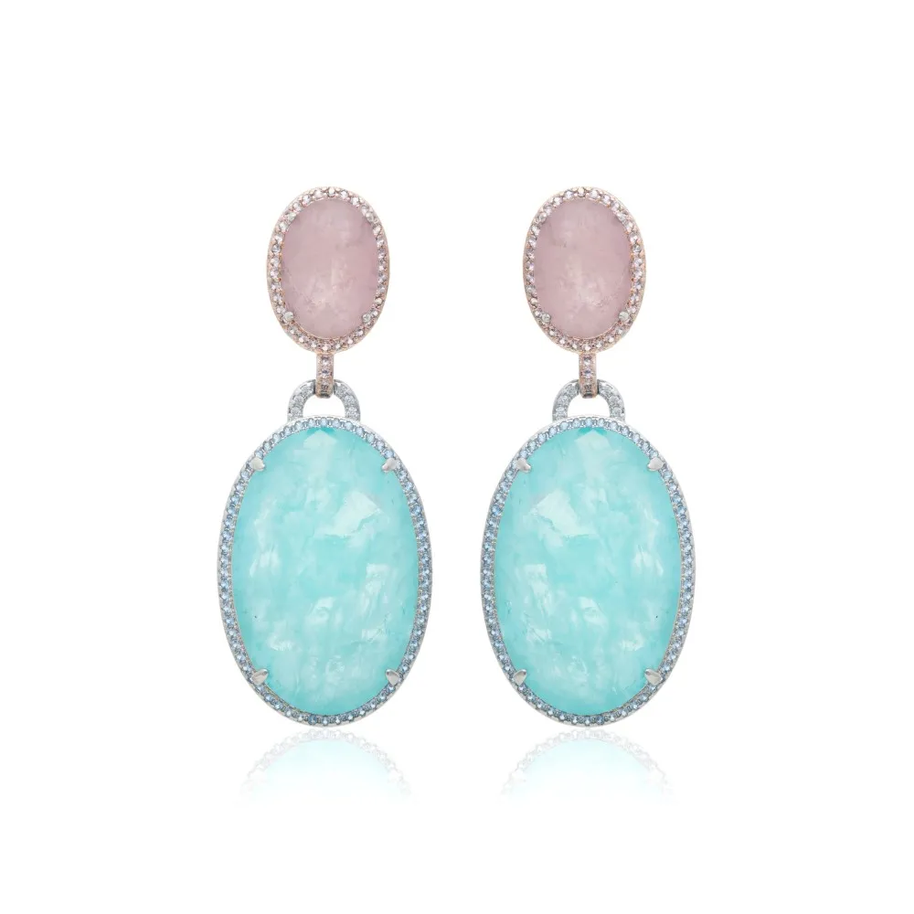 Brinco luxuoso com design de medalhão de fusion turmalina light e fusion morganita. destaque para o acabamento de zircônias brancas e rosas.