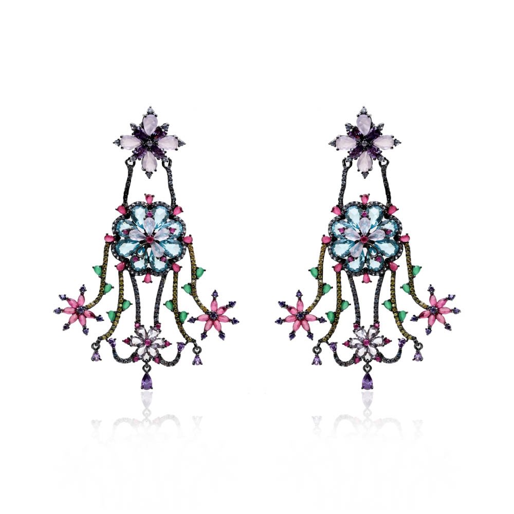 Brinco Semi Joia Flores penduradas com cristais coloridos