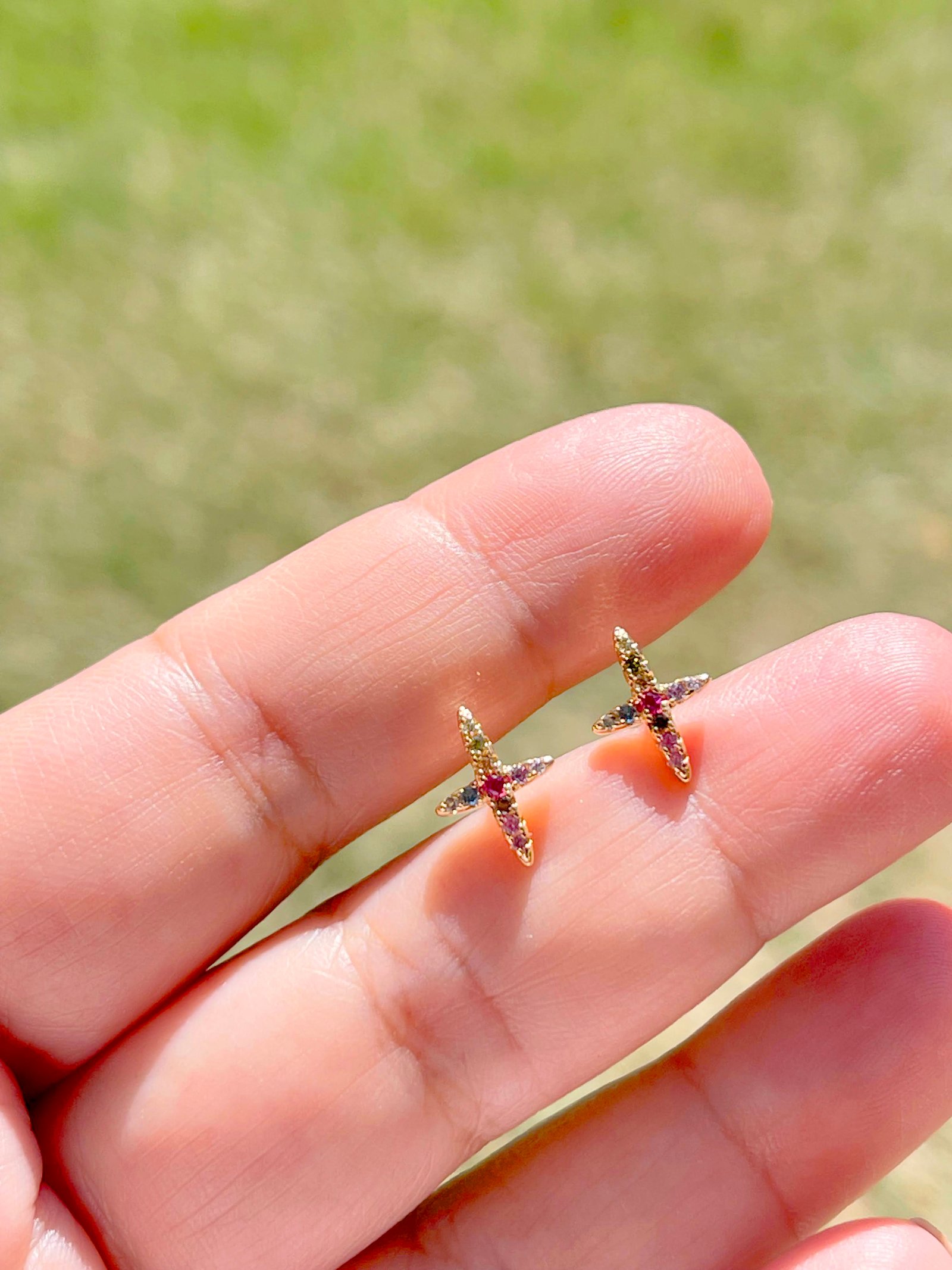 Brinco semi joia mini cruz cravejada colorida