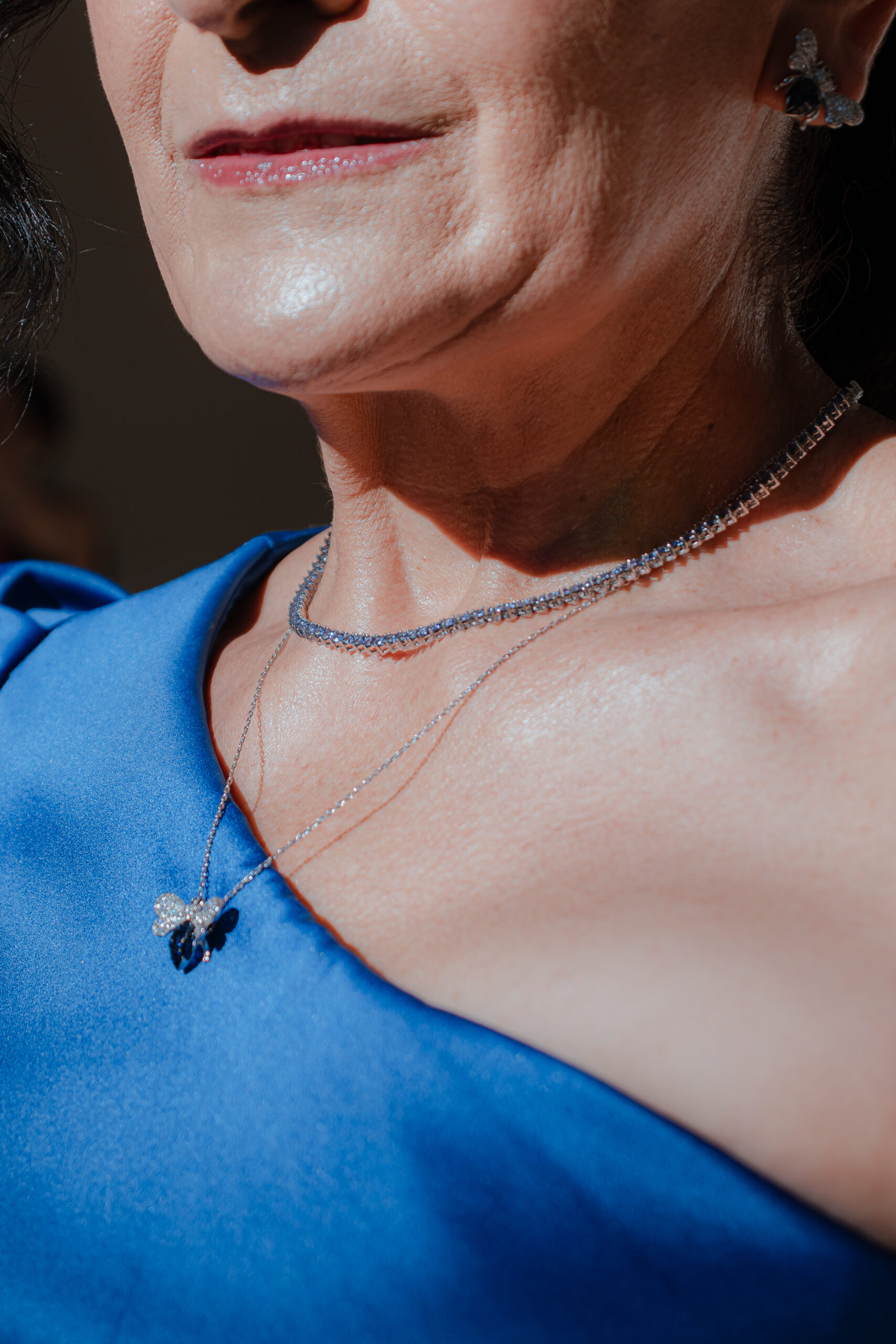 Colar Abelha Mosaico Cristal Safira Banho de Ródio Branco